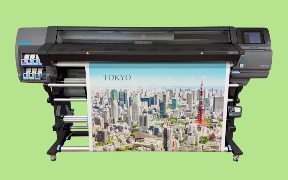 この大型溶剤プリンターはそんな看板に使われるステッカー印刷を得意とする耐久性の高いインクの印刷機で、屋外の利用に最適です。