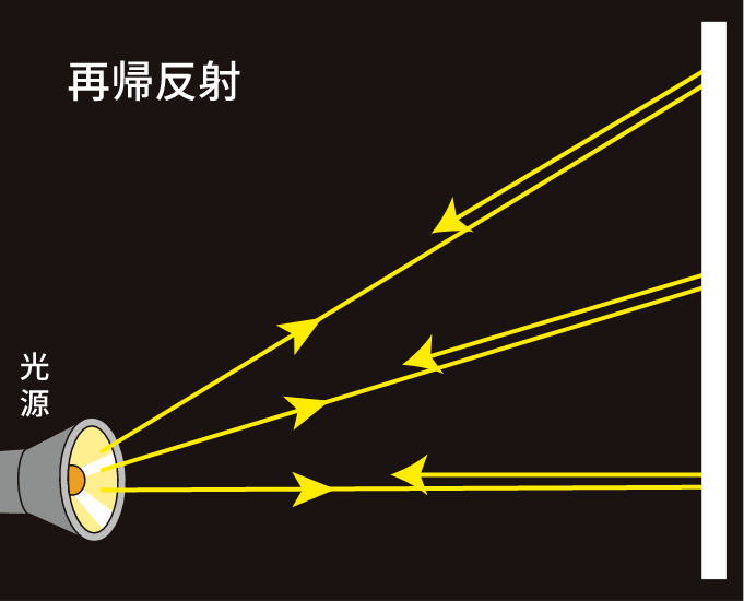 再帰反射は、車のヘッドライトや懐中電灯などから当たった光を効率よく来た方向へそのまま返す働きをします。