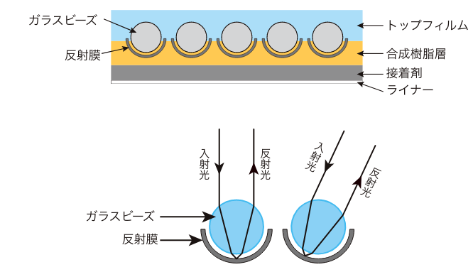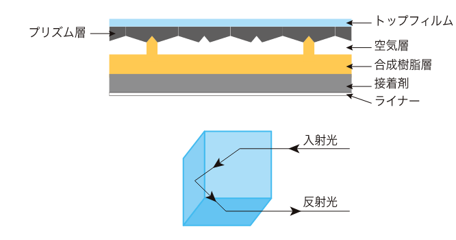 シートの中に微細なガラスの粒が入っており、入射した光を光源方向へ戻す(再帰反射)性質を持つ反射材です。機能性・耐久性に優れており、比較的安価で汎用性が高いため、道路標識や看板など幅広く使われています。