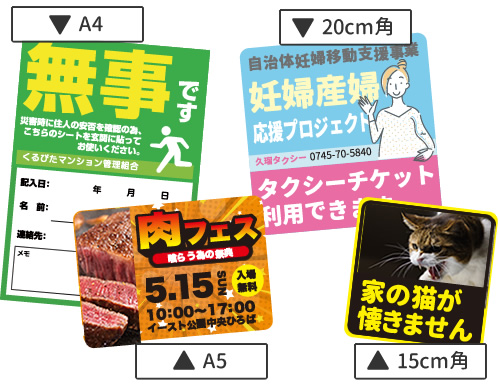 低価格なので地域・自治体の大型イベントの車用告知や、官公庁などでは選挙の告知・人権の日などの呼び掛け運動、災害時の玄関用安否確認マグネットなどに、大量マグネットを欲しいけれどコストも抑えたい方に最適です!